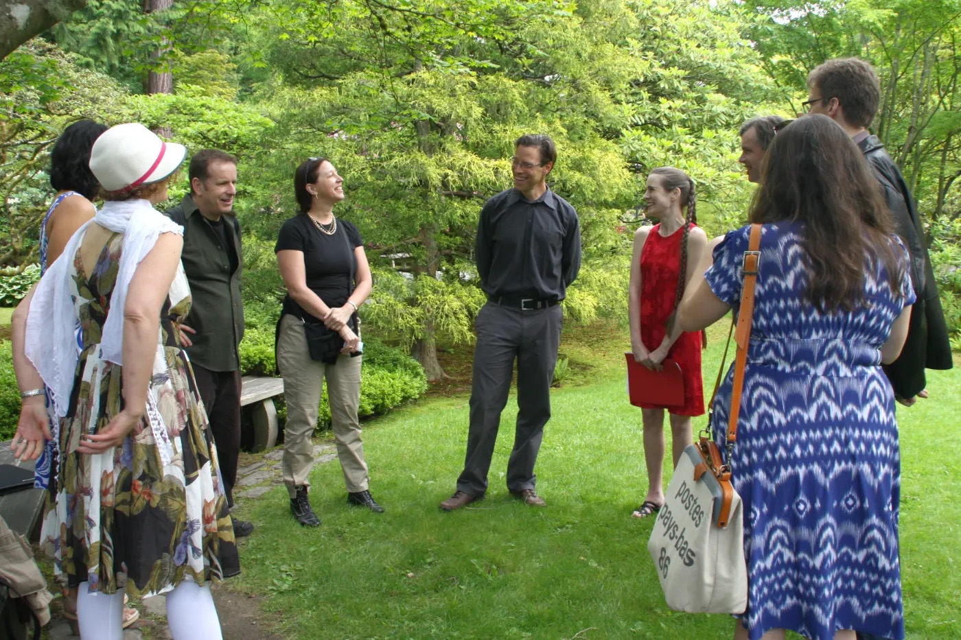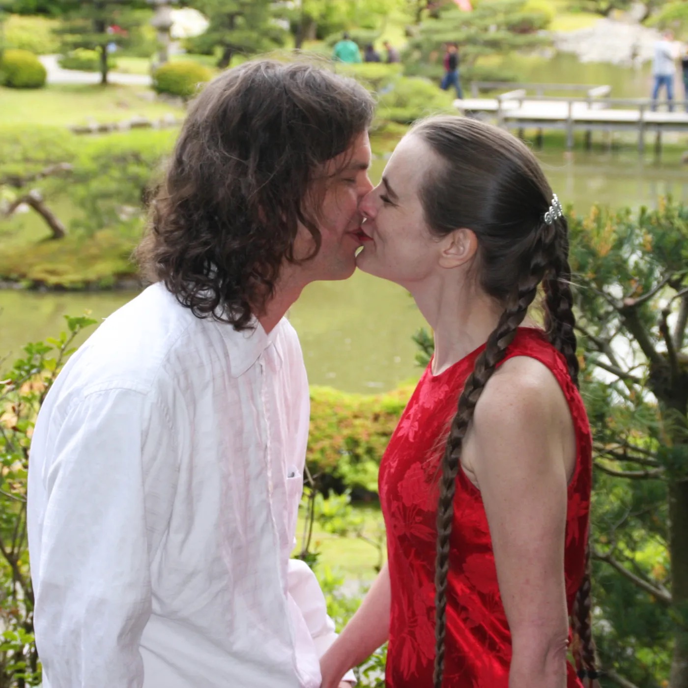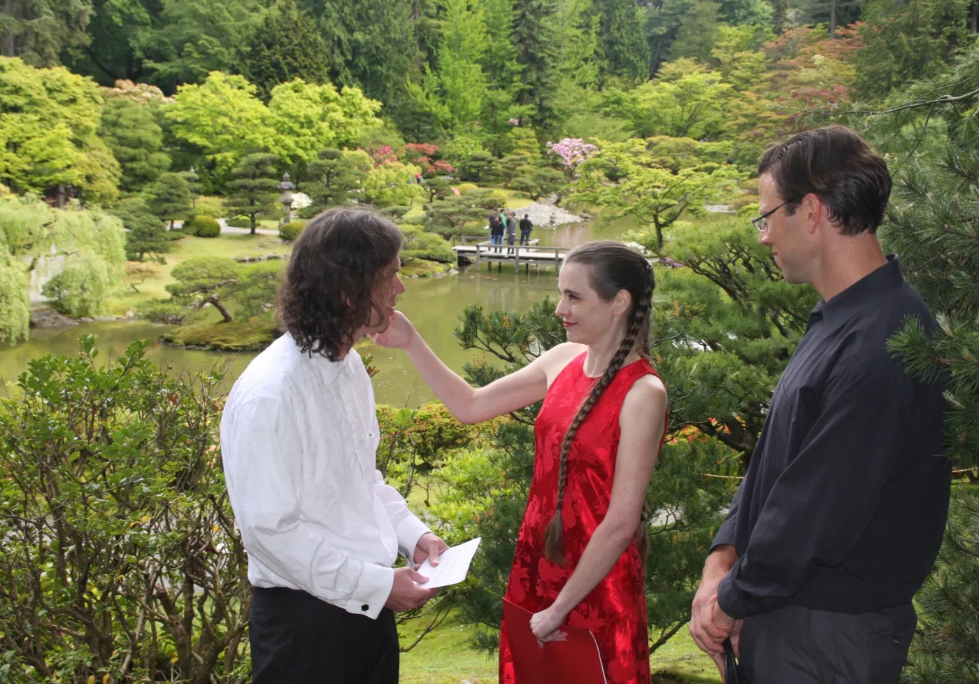 Instead we held a ‘guerrilla wedding’: we wrote our own ceremony, asked a friend to officiate, and spoke our vows in a public venue (Seattle’s Japanese Gardens) witnessed by just eight people. I wore a hand-me-down dress; Jak bought a shirt at Goodwill and borrowed cufflinks. Two of our friends took photographs.
